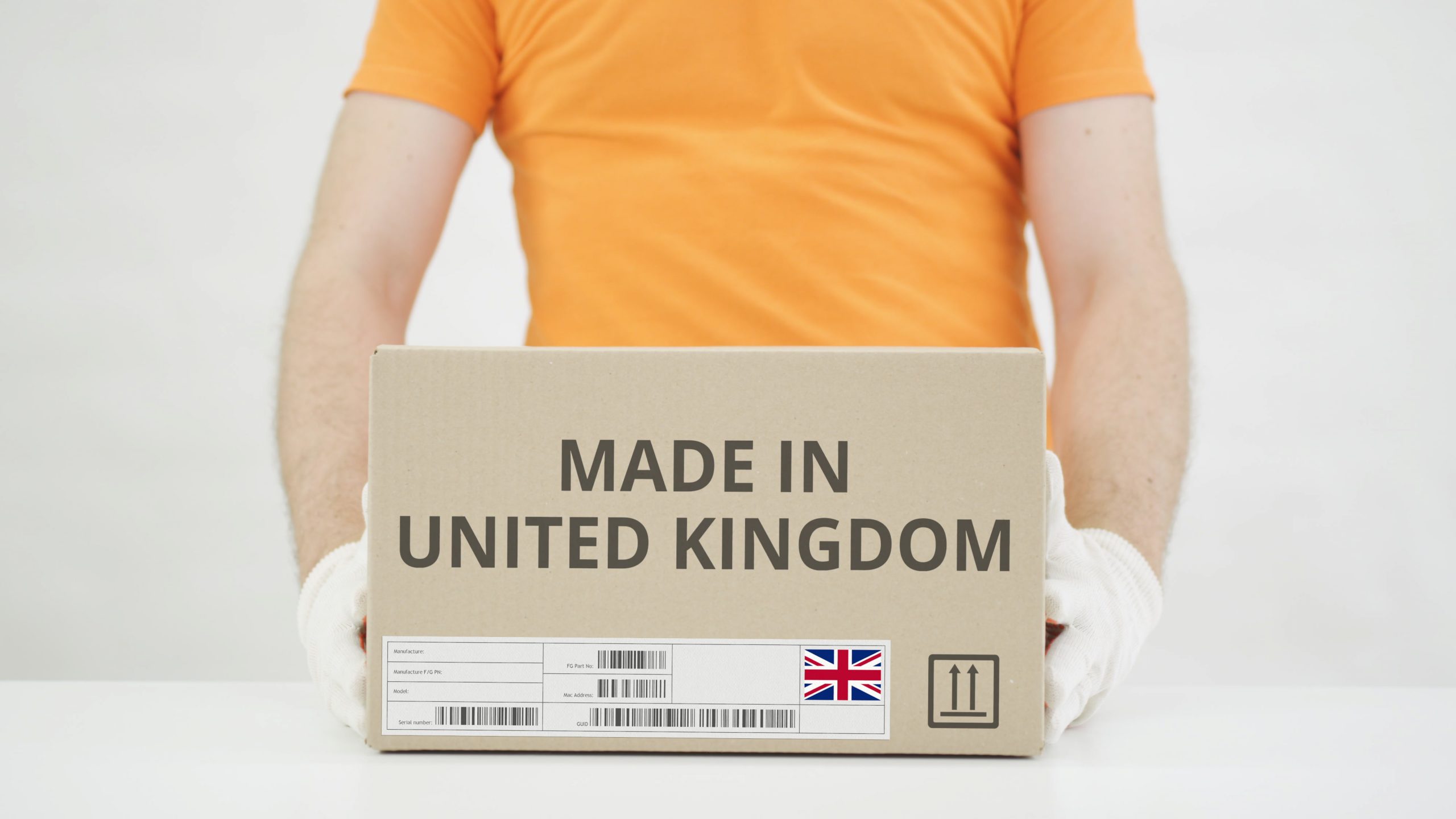 Man,Puts,Cardboard,Box,With,Made,In,United,Kingdom,Text