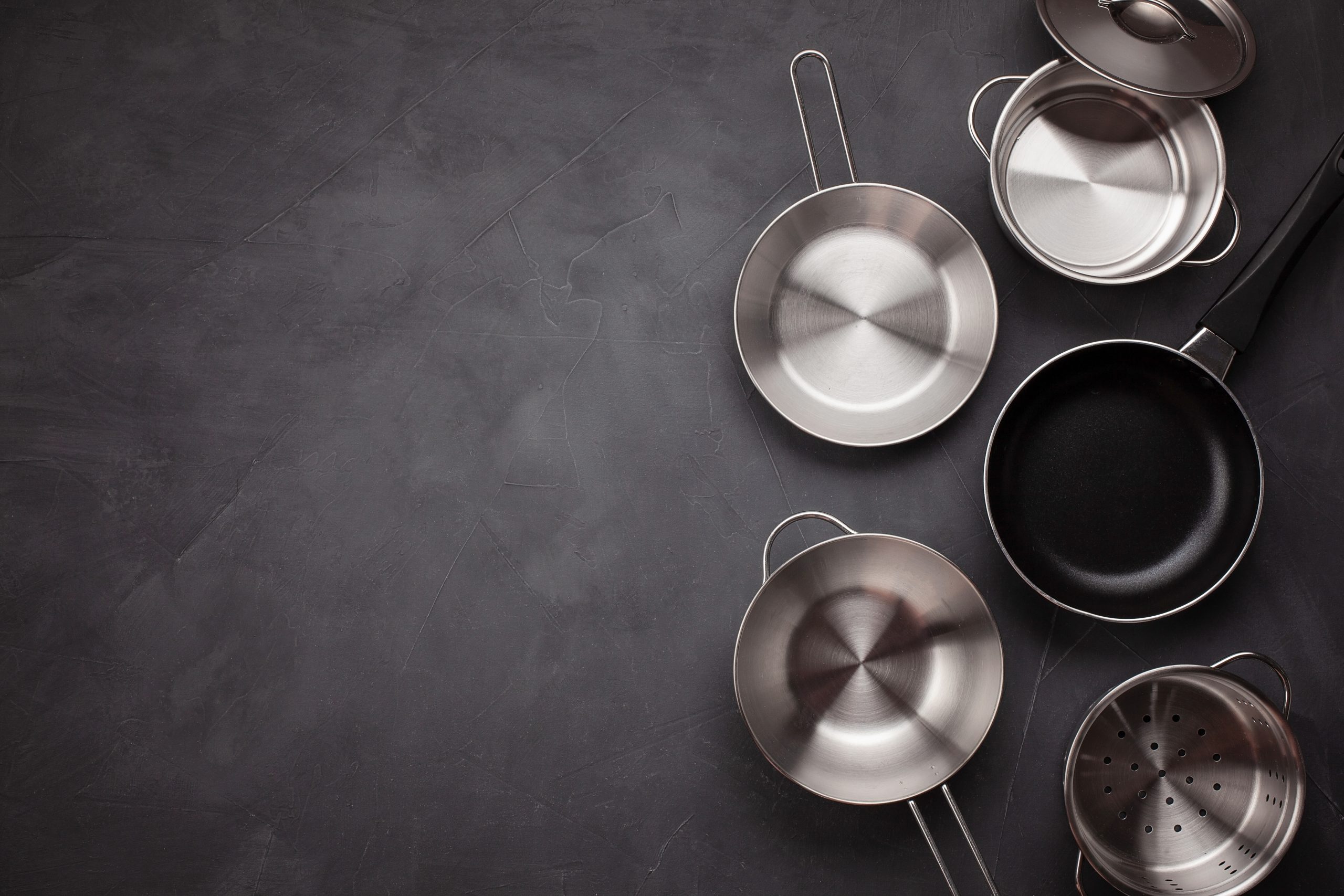Set,Of,Kitchen,Metallic,Pans.,Mockup,,Kitchen,Utensils,,Recipe,Book,